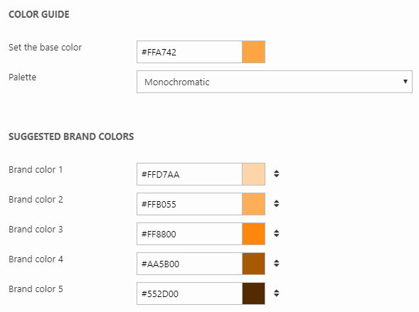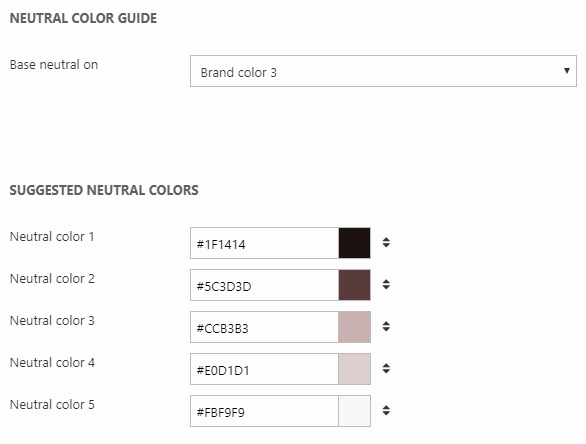 Brand colors are generated on the left side and neutral colors (based on a brand color) on the right side - it is also possible to override each generated color manually.