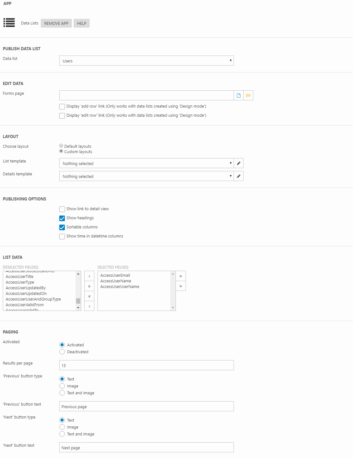 Figure 5.1 Use the module settings for the Data List app to publish a data list