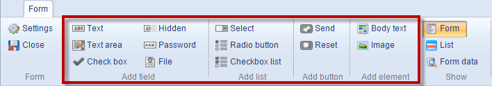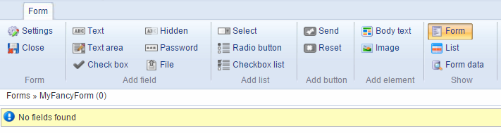 An empty form is pretty useless, but luckily you can use the forms for editors ribbon bar buttons (Figure 4.1) to add content – form fields – to the form.