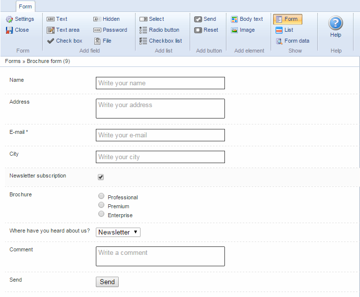 Forms are created from the Dynamicweb administration backend, and then added to a paragraph on your website using the Forms for Editors module.