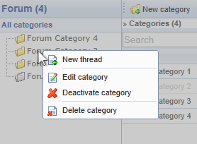 - The right click menu (Figure 11.2), which provides you with convenient shortcuts for e.g. creating, deleting or deactivating categories, threads and posts – the precise options depend on the content type.