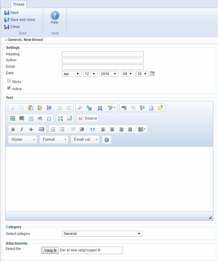 From here, you must fill in the details of the new thread – heading, author, e-mail (of author), date of publication, etc. – before saving it using the toolbar.