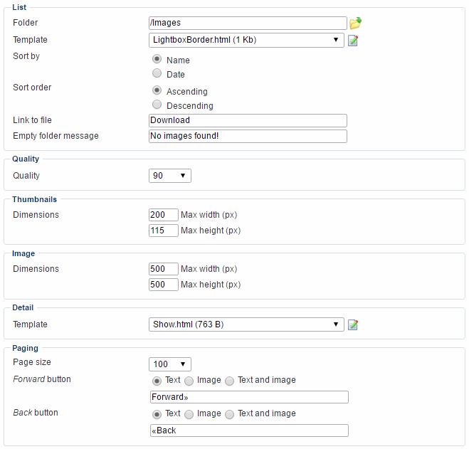 The Thumbnails and Image settings lets you set a max width and height for the thumbnail and the detail image – once the paragraph is saved, the images are automatically generated in your file system in subfolders called GalleryImages and GalleryThumbs.