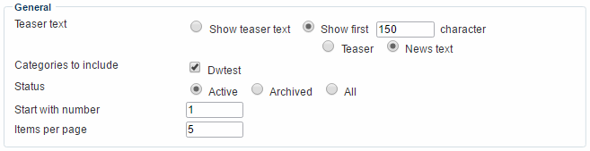 - Specify which news item to display first (start with number) in the total list of displayed news on your web page (number 1 is the last created news article) and how many items per page you want