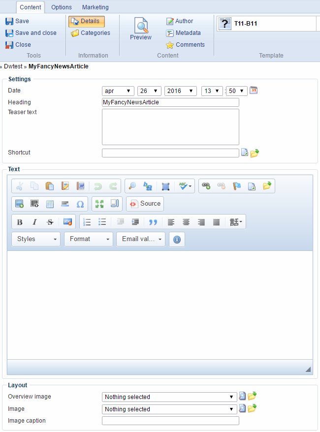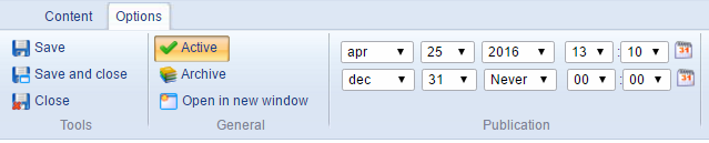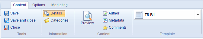 When creating or editing an article you have access to three tabs in the ribbon bar; content, options and marketing. From these, you may access advanced functionality related to news articles.