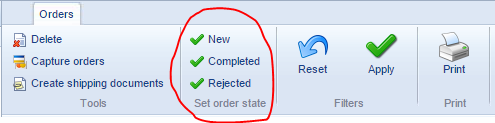 Marking one or more orders and checking one of these order state buttons will change the order state for the order(s).