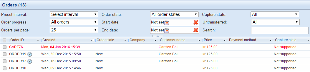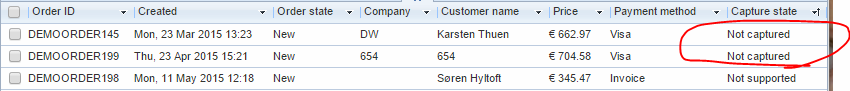 If the provider is setup to only authorize the payment, all incoming orders are set to Not captured in the order list when successfully completed. A few providers don’t support capture from external services like Dynamicweb. They are listed with Not supported and you need to capture the payment from the administration at the provider website.