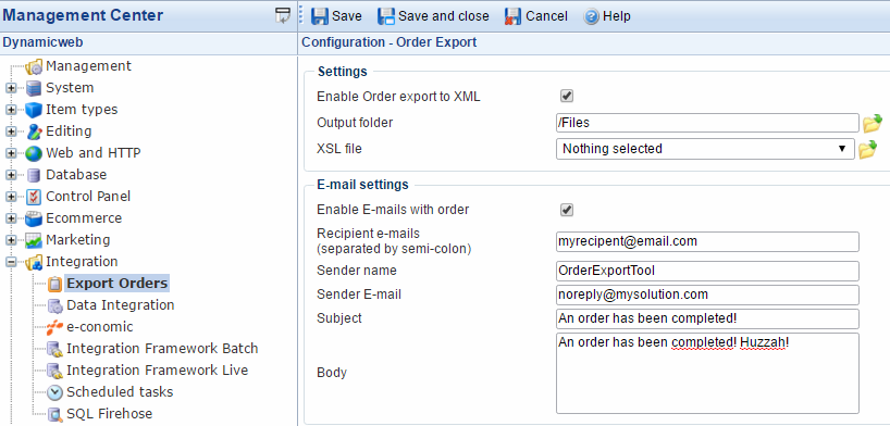 Dynamicweb can be set up to automatically generate and export and XML file containing the order details every time an order is completed.