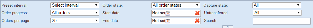 • Find orders based on start and end date, or on a preset interval (like today or latest week). Choosing an interval automatically inserts the corresponding dates in the date fields.