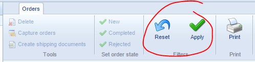 Your filter settings are automatically remembered by the system. This means that when opening the order list the next time, all filter settings will be pre-filled. If the filter area is hidden, then the area will blink shortly to indicate that special filter settings has been applied. To reset the filter settings, click Reset in the toolbar.