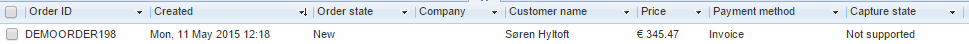 In this case, the columns show the order ID, the created-timestamp, the order state, the customer company and name, the total order price, the payment method used, and the capture state of the order.