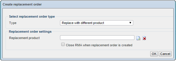You can create a replacement order directly from an RMA by clicking the Create order button from the toolbar. This opens a dialog (Figure 9.1) allowing you to create different kinds of replacement orders.