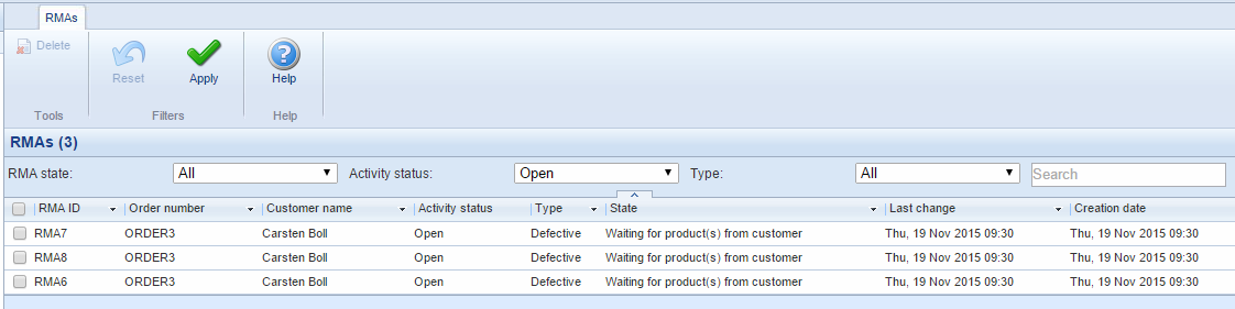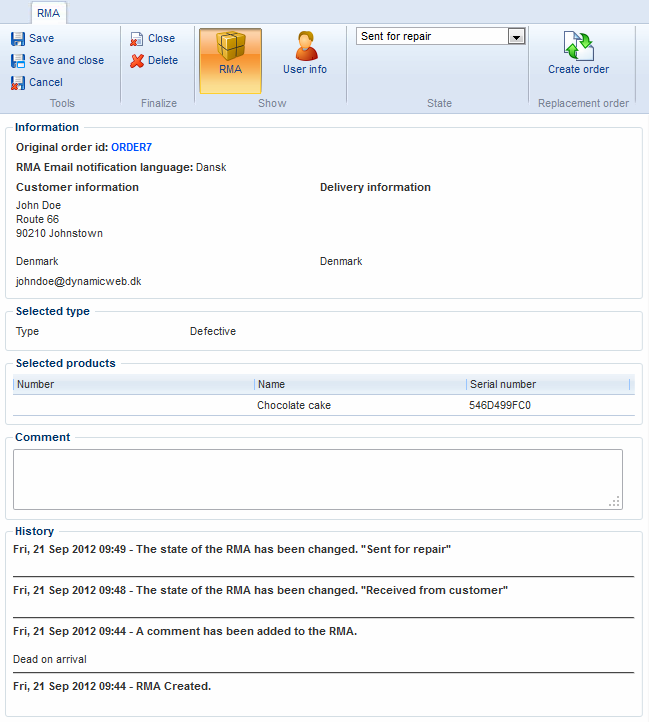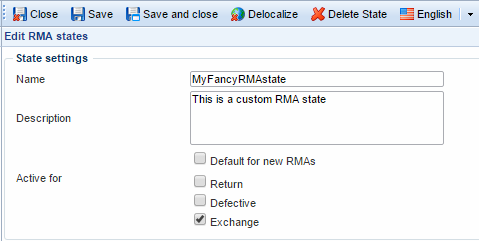 RMA states are custom states for controlling your RMA process. A Dynamicweb solution is born with a number of default states, such as ‘Waiting for product(s) from customer’, ‘Rejected’ and ‘Sent for repair’ – but you can easily create new RMA states