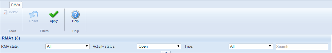 From the RMA list toolbar (Figure 5.1), you can filter and search the list.
