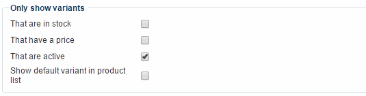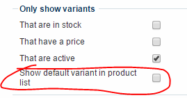 Once the variant configuration has been saved, you can select a default variant in the Default dropdown. You can have this default variant displayed in the frontend instead of the main product by going to Management Center > Ecommerce > Advanced configuration > General and checking the Show default variant in product list checkbox (Figure 6.3).