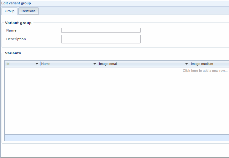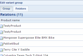 The Relations-tab (Figure 4.1) provides you with an overview of all the products which use the variant group in question. Click the products to go to the product details view for the main product.
