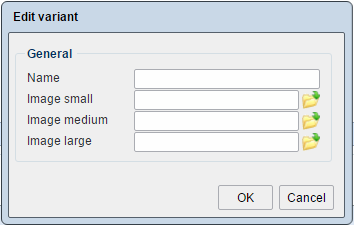 • Optionally, provide one or more images for the variant (e.g. a square showing the color, or a shirt-icon with an S on it for the size-value small, etc.).
