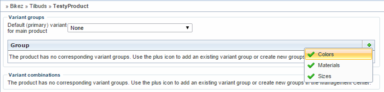 • Add all the variant groups you want to use for the variants by clicking the green plus-icon and clicking the variant group from the dropdown. Adding or deleting a variant group after you have created combinations will reset the combinations area, and you’ll have to create your combinations again.