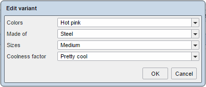 Once you have created one or more variant groups and variant group values, you can start creating simple variants based on one of your existing products.