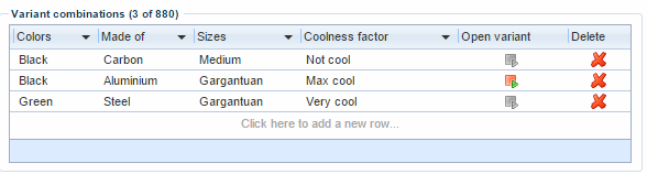 • Delete a variant combination by clicking the red X-icon at the end of the row.