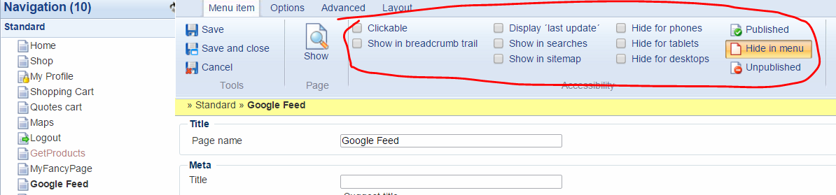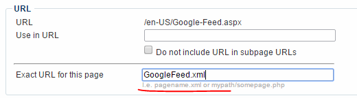 In the page properties > URL settings area, enter GoogleFeed.xml in the Exact URL for this page field (Figure 5.2) – Google requires the feed to be named .xml.