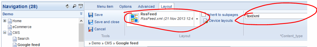 Viewing the page in frontend, however, will still result in a browser error; the page is served as an RSS feed, but the content of the channel node (with the content placeholder dwcontent) is still HTML, since it’s based in the default product list template.