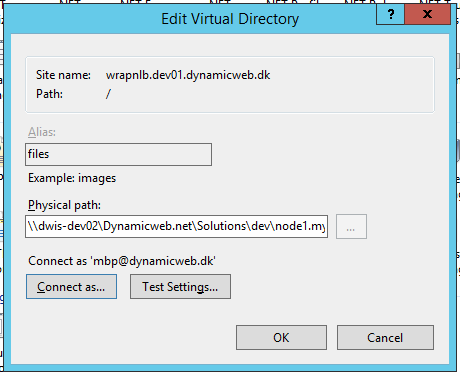 In the Edit Virtual Directory, click Connect as and select a domain user with Full Control permissions on DW Server 1 (Figure 7.1).