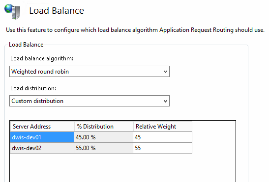 In the Load Balance window select distribution algorithm. The algorithms “Least current request” and “Least response time” can be used for Dynamicweb usage, but “Weighted round robin” is the recommended method as it allows you to adjust the relative weight of server thus accounting for differences in load or hardware.
