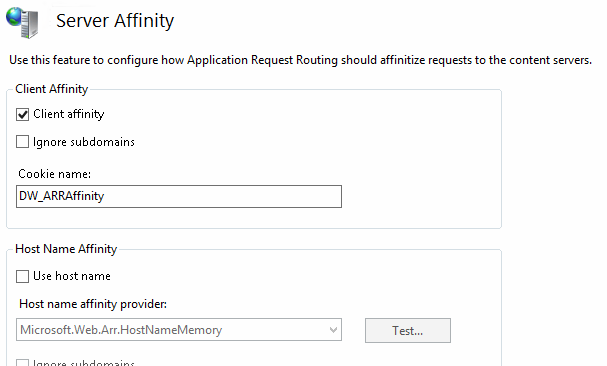 In the Server Affinity window (Figure 8.3) it is important to select Client Affinity. Host Name Affinity will not work with Dynamicweb.