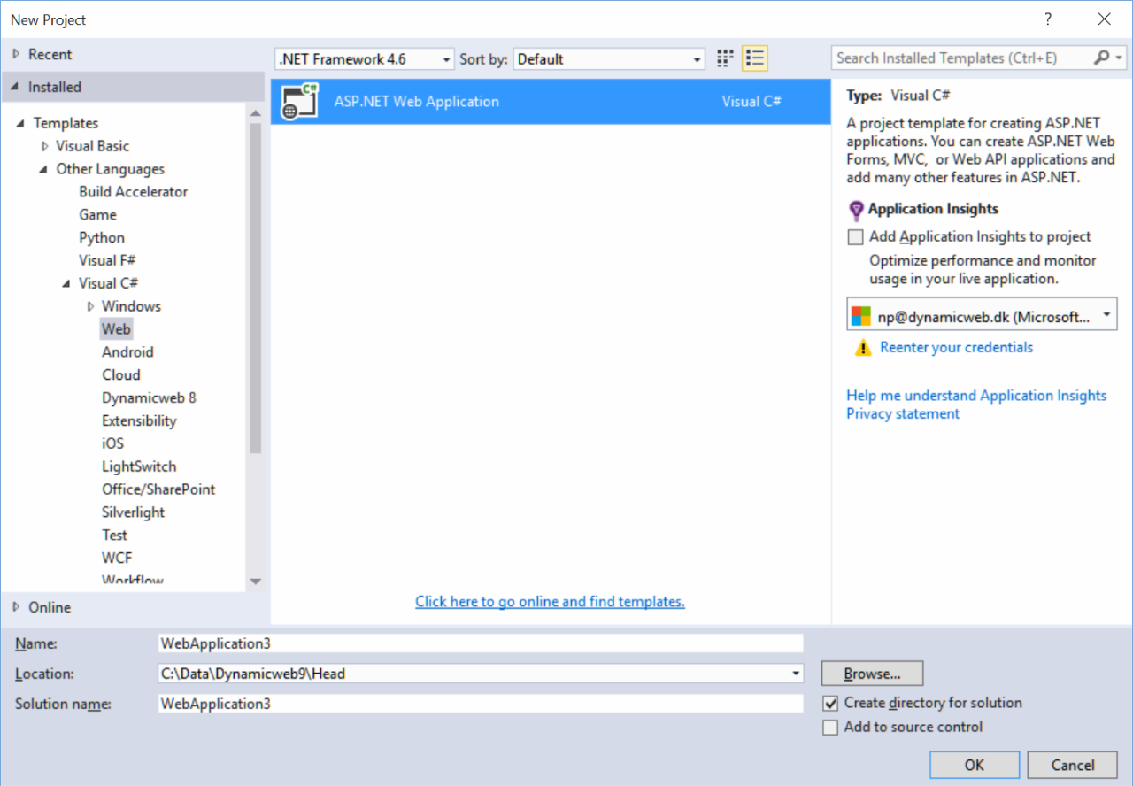 From the Dynamicweb application, take web.config and replace the one in the newly created solution (after a backup has been taken).