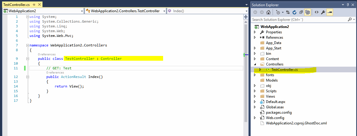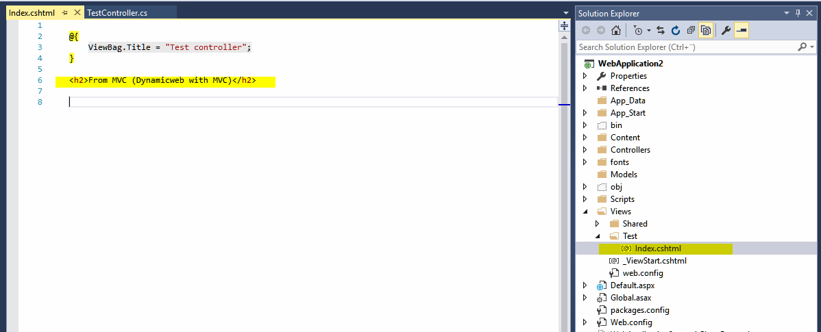 In the Visual Studio solution, add a Controller and a View (“Test” in this Figure 9.1).
