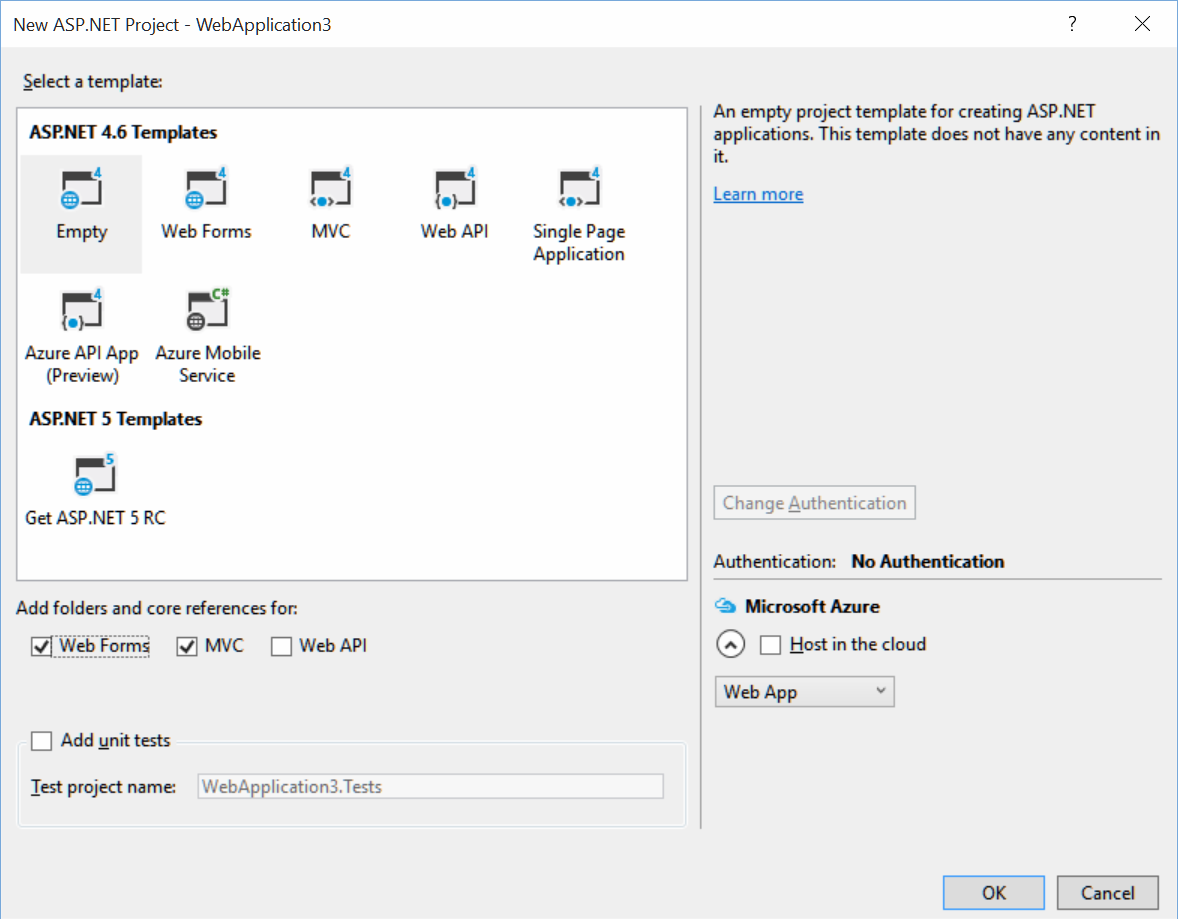 • Choose an empty project with Web Forms and MVC folders added (Figure 2.2)
