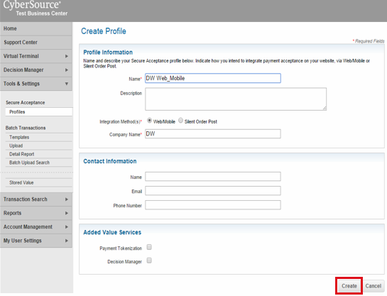 - Go to Tools & Settings > Secure Acceptance > Profiles and click “Create New Profile” in the bottom right to create a payment profile