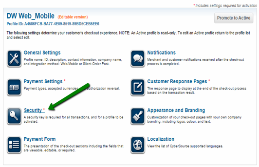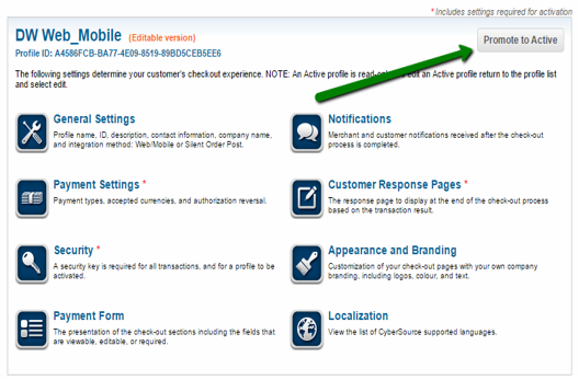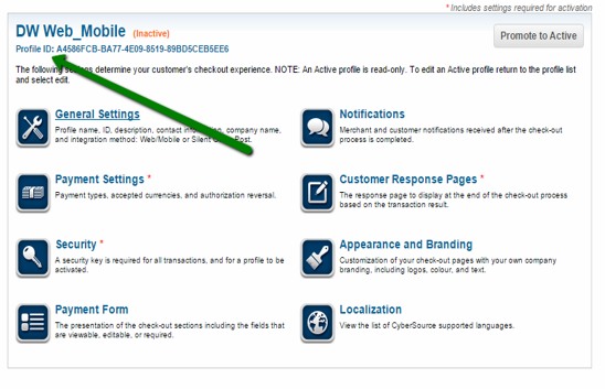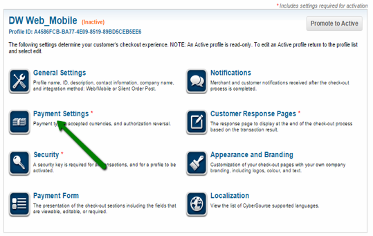 - Enter your Merchant ID and profile ID provided to you by CyberSource