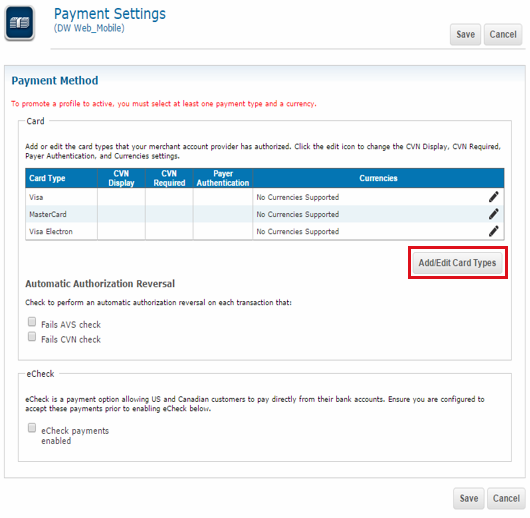 - Click “Add/Edit Card Types” and select any card types you’ll accept payments for. If you decided to accept eChecks, you should enable these as well