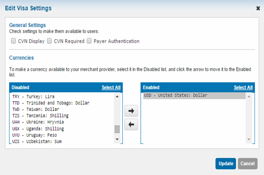 - Once you’ve added your card types, you’ll need to add the currencies you’ll accept. Click the pencil “edit” icon to add these currencies