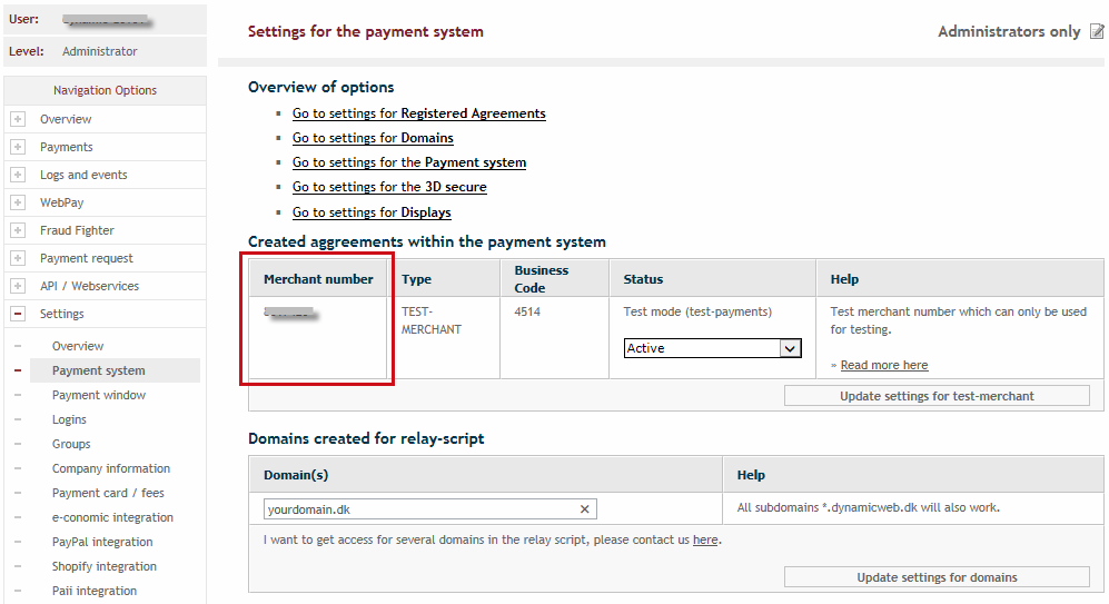 In the ePay administration in Settings > Payment system you can find your merchant number that you need in order to setup the provider in the Dynamicweb administration.