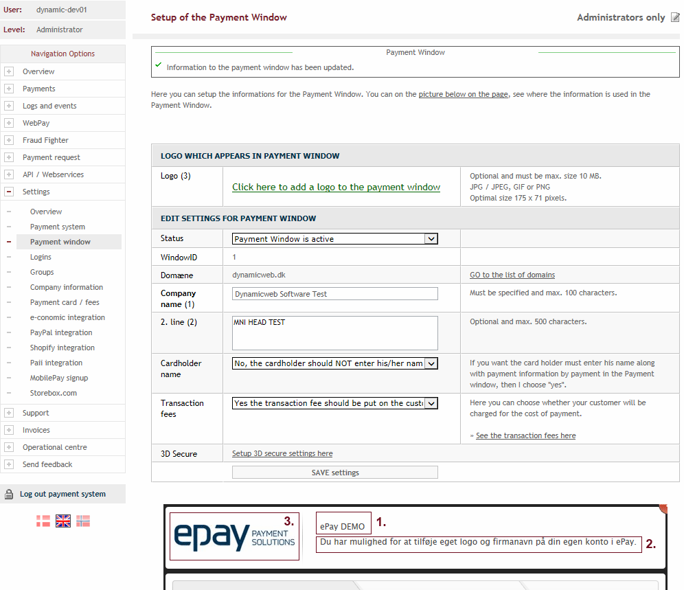 You can get an overview of your payment windows or add new from the ePay administration in Settings > Payment window - If you use MD5, write the MD5 key you entered in the ePay administration in Settings > Payment system. We recommend that you use MD5 to secure the data that is transferred between your Dynamicweb solution and ePay