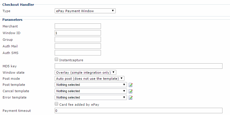 - Post template – the template that is used for posting transaction information to ePay. Used when Post Mode = Render template.