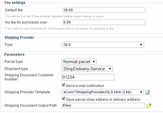 Please note, that the GLS shipping provider does not fetch fees or rates – rather, the way to set it up is to create a shipping method per parcel or shipment type, and manually enter a fixed fee in the fee settings, as in the screenshot above. The GLS shipping provider merely fetches nearby ShopDelivery locations.