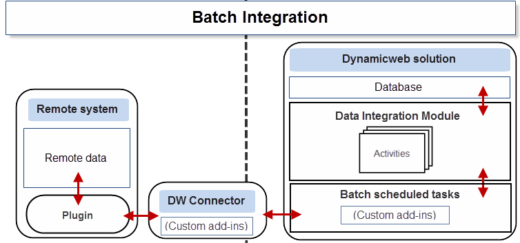 A batch integration consists of periodic updates, where data is retrieved from a remote system and imported into the Dynamicweb database – and exported from Dynamicweb and imported into a remote system.