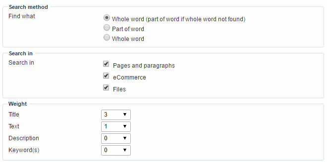 The first items on the module settings are the Search method, Search in and Weight settings (Figure 5.1).