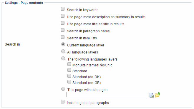 If you use the module to search in page and paragraph content, you can use the page content settings (Figure 7.1) to further control the module behavior.
