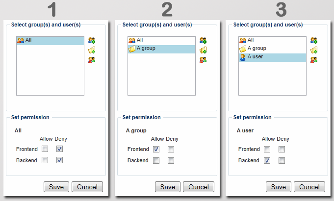 - Permissions in Dynamicweb are always set on the restricted content or module and never on the user