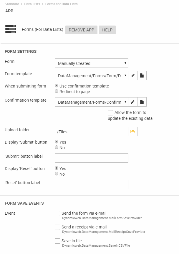To render a form in frontend, attach the Forms for Data Lists app to a paragraph and use the app settings (Figure 7.1) to control the process.