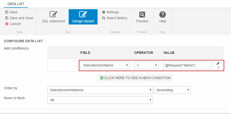 You can use either the Design Wizard – as above – to select fields, operators and values to test against, or you can use the SQL statement mode, which allows you to create the SQL statement manually.