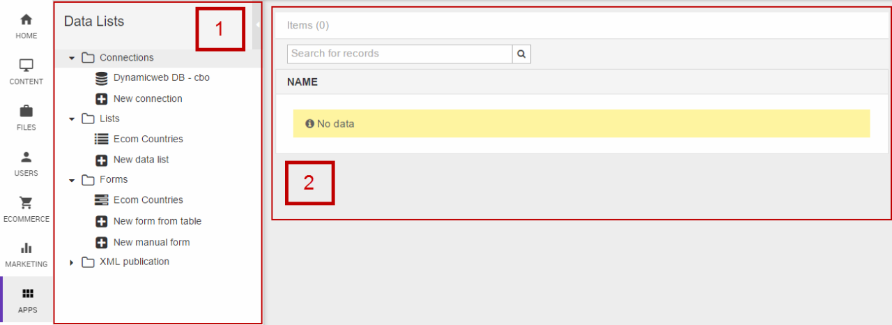 - A tree menu (1) from which you can create new connections, data lists, forms and XML publication templates