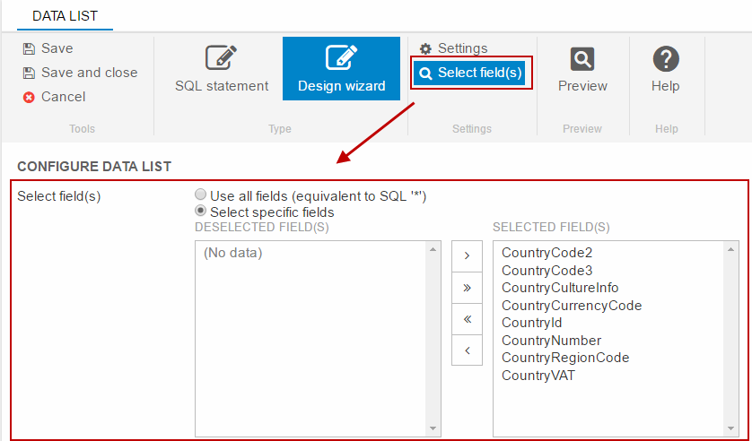 If you use the design wizard, the Select Field(s) button in the ribbon bar allows you to specify which fields from the database table you want to render in frontend when publishing the data list (Figure 4.1). Simply move the fields between the two lists until you have the desired configuration.