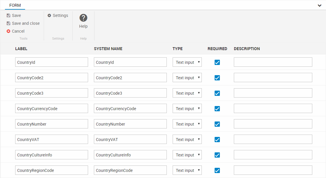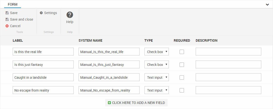 You will now see an automatically rendered list of form fields, including labels, system names, type specifications, a required checkbox and a description field (Figure 6.1).