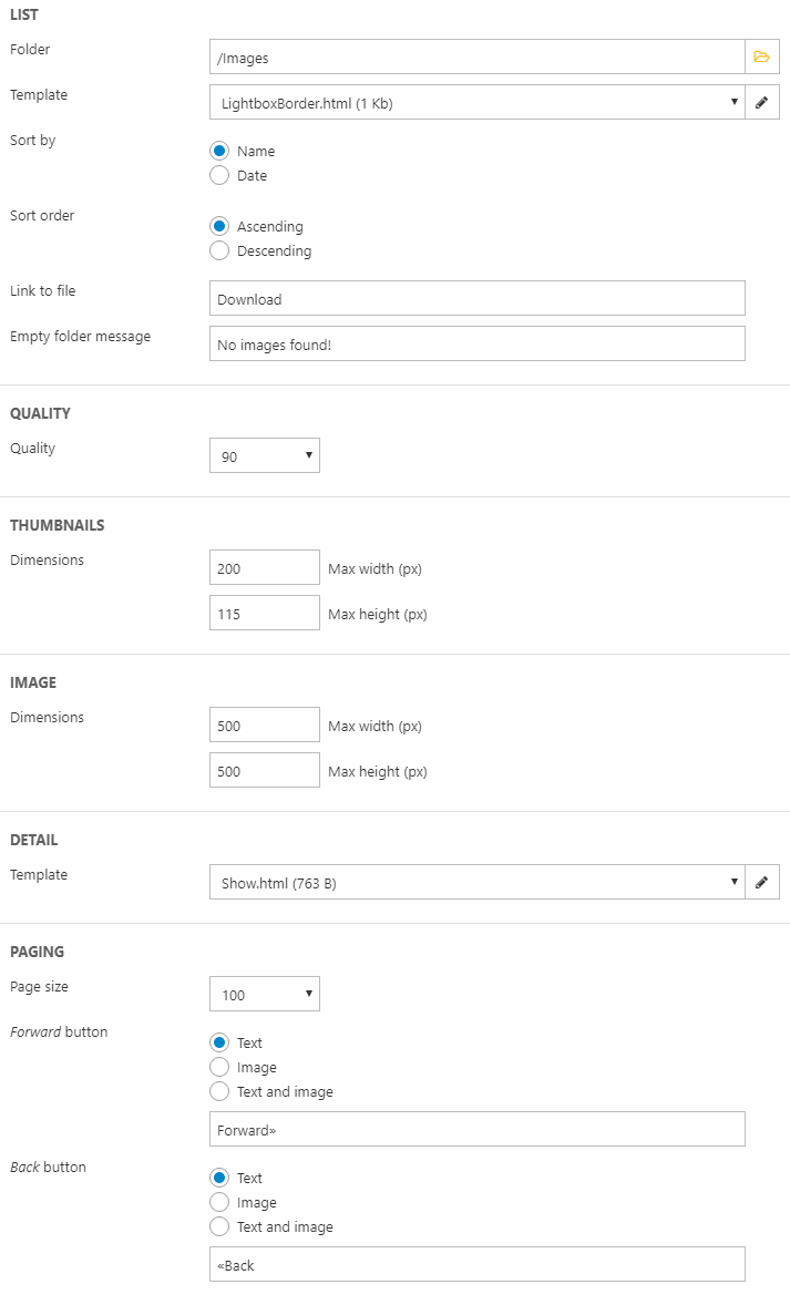 The Thumbnails and Image settings lets you set a max width and height for the thumbnail and the detail image – once the paragraph is saved, the images are automatically generated in your file system in subfolders called GalleryImages and GalleryThumbs.